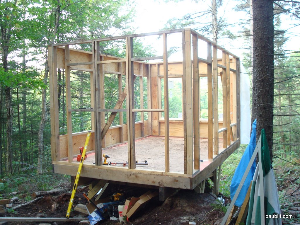 The framing of the cabin was straightforward. We used rough-sawn lumber and 3/4 inch plywood sheathing. I used a simple framing scheme with no headers above the windows and a single top plate on the walls. I used 3/4 inch plywood power nailed to the lumber with ring-shank nails to tie everything together into a strong and stiff wall system. I was confident that with this heavy sheathing, the minimal structure would be plenty strong.