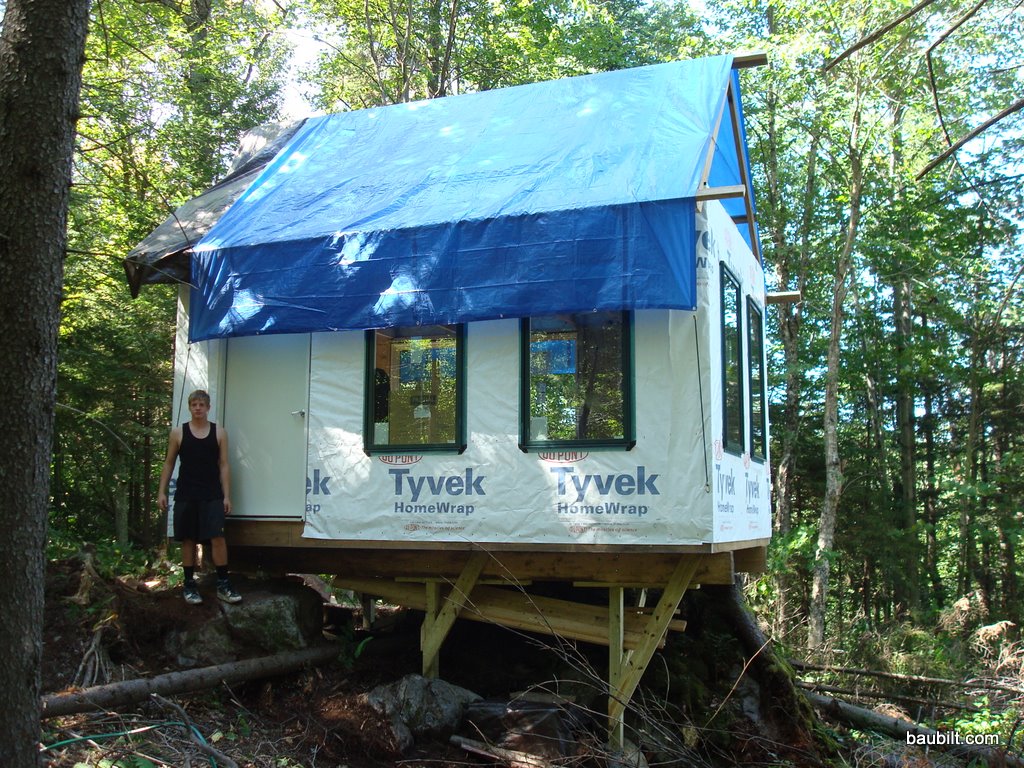 We put some blue tarps over the roof and left it for two weeks until I could get back and put up the roof panels. Starting from the deck and ending at this point was two days of work, with significant help from my father on the first day.