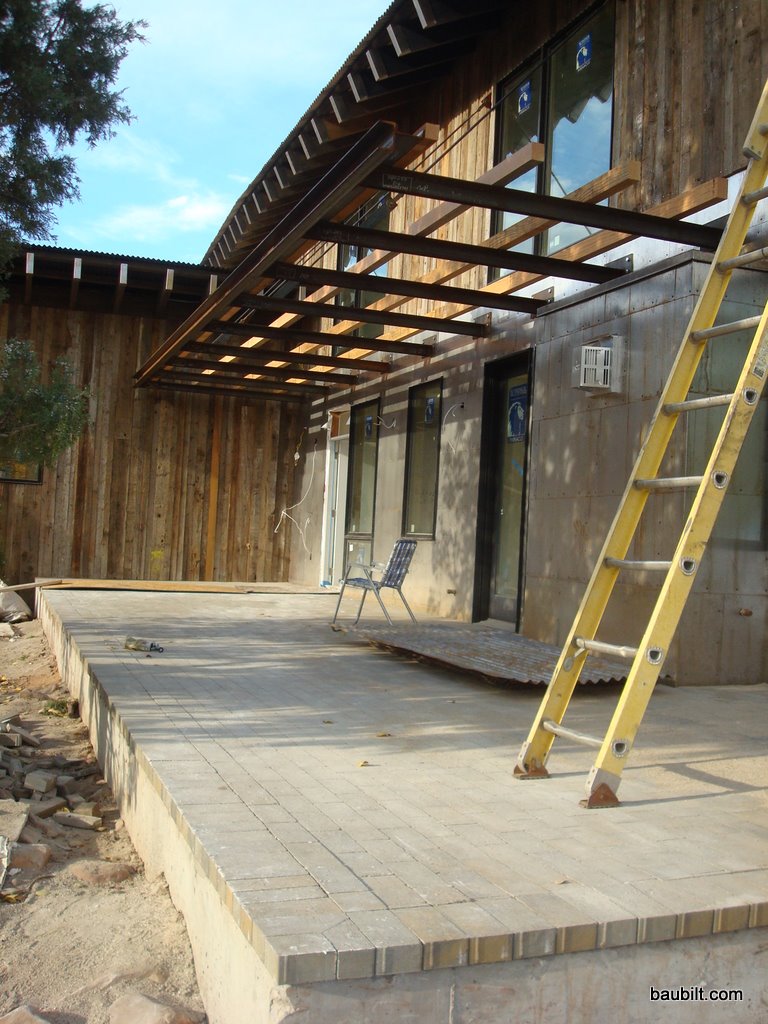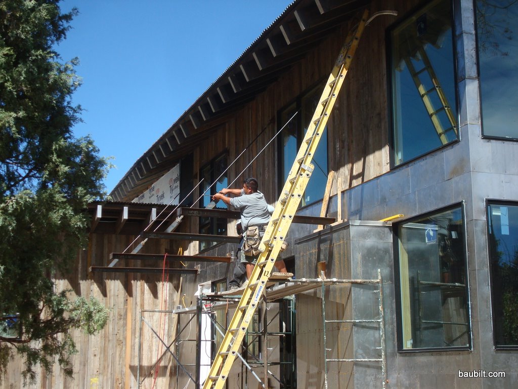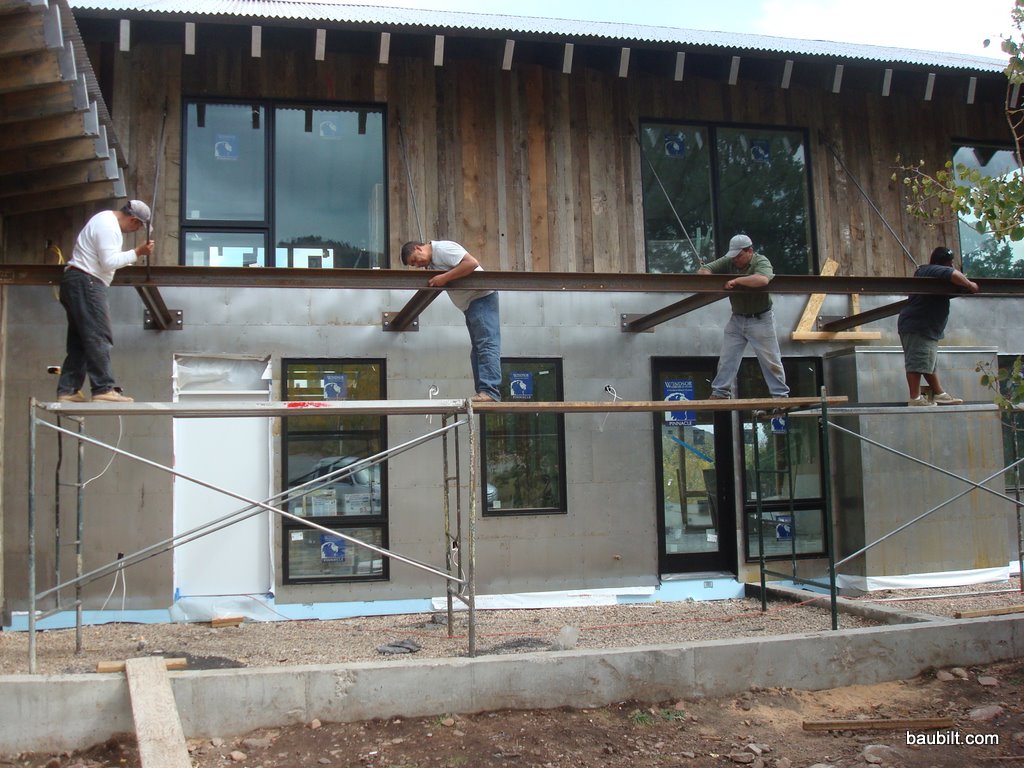 The house will have an 8-foot-deep nearly flat roof over the terrace. It’s kind of like a store-front awning. The architects designed it to be supported by four tie rods, which gives it a cool look, and avoids using any columns to support the edge of the roof. Of course the problem is that this structure has to be designed to handle all the snow from the roof above landing on it in an avalanche. So, it’s incredibly beefy and ties into big steel columns in the walls. This feature of the house probably cost about $10,000 more than a conventional “porch roof.” Still, I can’t imagine a better use of $10,000 in giving the house a distinctive quality.