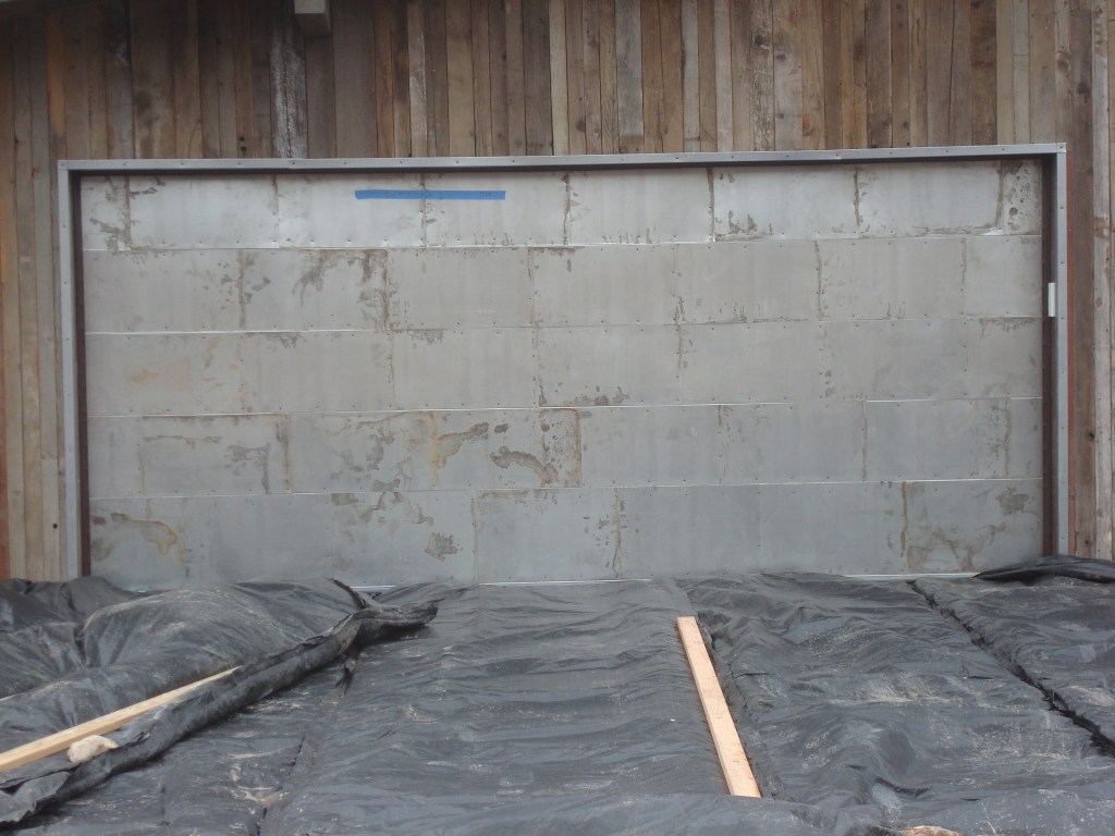 I bought a relatively cheap and ugly steel “raised panel” garage door. I then had the roofers apply the steel siding panels to it. Then, the garage door guys came back, weighed the door, and hung it with the appropriate springs. The whole thing cost about $2000, much less than a “custom” door.