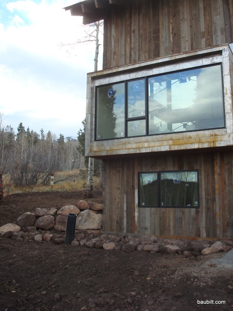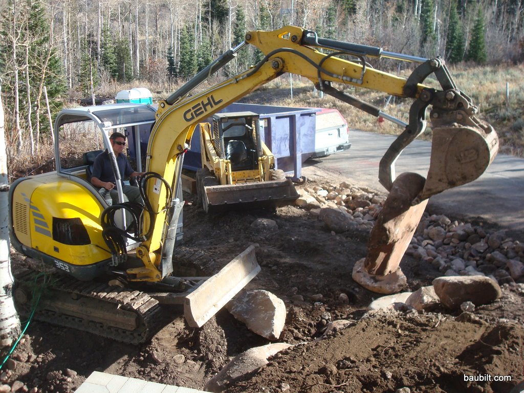Of course no one has any money at the end of the job…so the landscapers kind of have to make do. My guys (Sierrascape Landscaping) did nice work over 2 – 1/2 days in early November. They built three nice retaining walls, created a rock-lined drainage ditch around the property, installed a 5-foot wide border of river stone on the ground under the roof line, spread top soil over the site, and seeded it with “cabin mix,” a high-altitude meadow grass. We’re hoping that come spring, this seed will germinate and return the landscape back to nature, approximately.