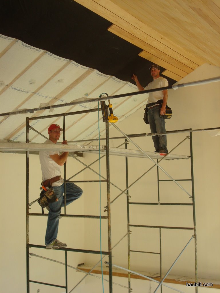 The wood ceiling in the great room and master bedroom is 1×6 clear mixed-grain hemlock. I had it prefinished, so the finish carpenters just pin nailed it in place, filled the nail holes. It’s then done. No one has to get up there again. This material is not cheap: $1.72/linear foot for the material and $0.67/linear foot for clear finish. So, this comes out to about $5.50/sq-ft of finished ceiling for material, including about 10% waste. My finish carpenter, Eric Epps, first stapled up black landscape fabric (cheap). I had him leave a 3/8″ gap between boards. This gives a nice linear effect. Everyone loves this ceiling.