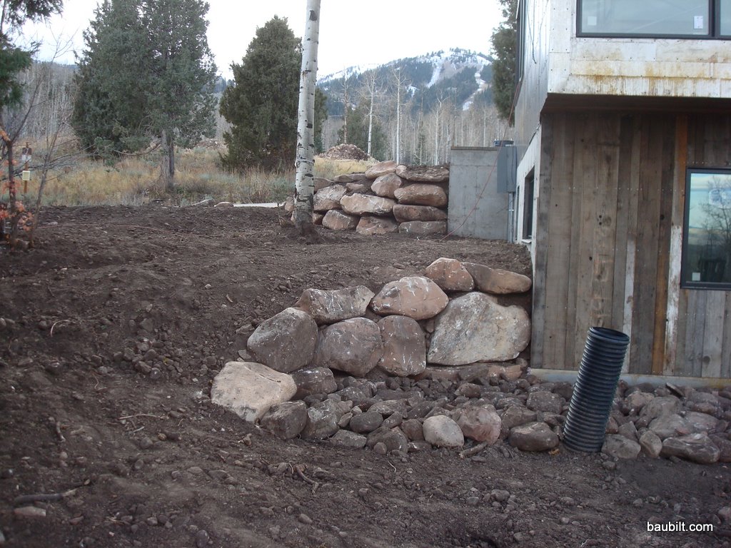 Of course no one has any money at the end of the job…so the landscapers kind of have to make do. My guys (Sierrascape Landscaping) did nice work over 2 – 1/2 days in early November. They built three nice retaining walls, created a rock-lined drainage ditch around the property, installed a 5-foot wide border of river stone on the ground under the roof line, spread top soil over the site, and seeded it with “cabin mix,” a high-altitude meadow grass. We’re hoping that come spring, this seed will germinate and return the landscape back to nature, approximately.