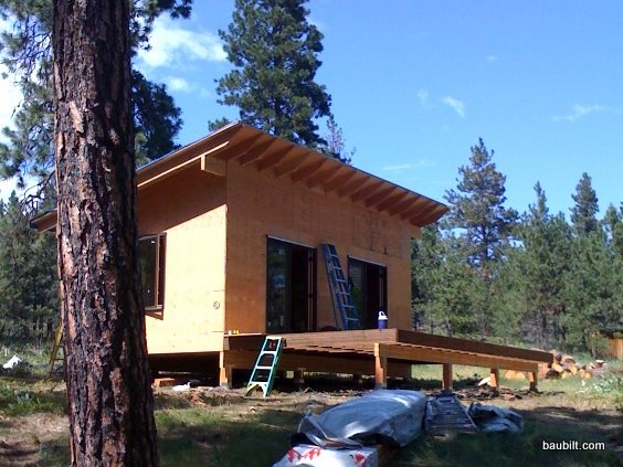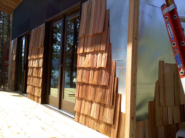 On the main cabin we have had woodpecker problems over the years. Apparently the woodpeckers like to nest up high with a vantage point of the meadow. The gable end of the main cabin was perfect and they had made a mess of the tongue-and-groove cedar siding. We had patched with metal, but finally had to take drastic measures. My father-in-law had a guy apply galvanized steel sheet to the walls and then apply cedar shakes over that. This has mostly worked. Occasionally a wood pecker will attack, but after 1/2 inch of progress will give up. So on the pavilion, we’re taking the galvanized-plus-shakes approach from the get go.