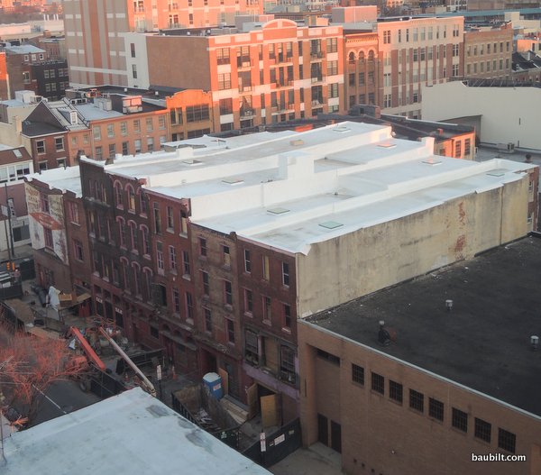 Of course one tricky problem is how you get the water off the roof. In city settings like this, you can’t just run it off onto the ground. You also have to get it off the middle of the roof, not the edges, because of the way the roof pitches work. As a result, there are central drains on the roof sections, with cages over them to prevent debris from entering. These must be plumbed into the city storm water drainage system. We’re shouting distance from the Delaware River, so my guess is that the drain runs into the river quite nearby.