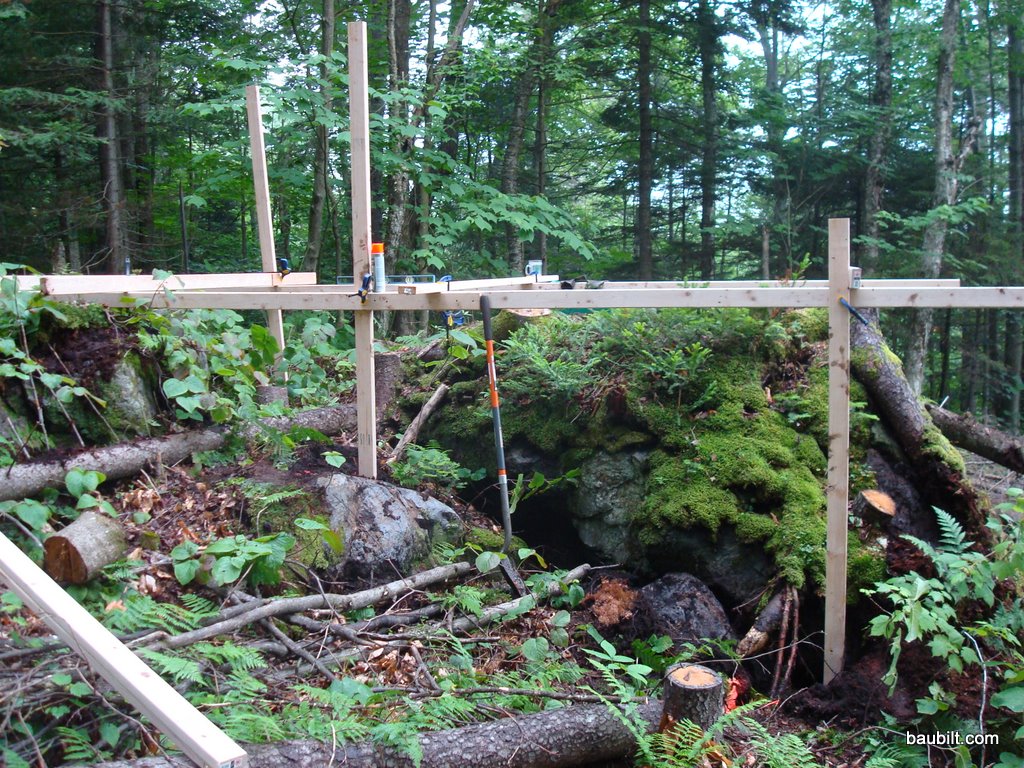 Here I laid out the structure with some 2x4s to figure out how to orient it relative to the boulder. The boulder is covered with moss and lots of wet organic stuff as is typical of this part of Vermont.