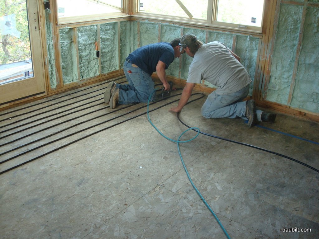 Yesterday, Chris and Justin from CRS Mechanical started stapling down the 1/2″ diameter PEX tubing that is a key element of the hydronic heating system. The tubing will be embedded in 3″ of concrete, which in my case will form the finished floor. The tubing is stapled down first; then #2 rebar is laid over it; then the concrete is poured. The staple-down phase goes pretty quickly with the right tools (a spindle for uncoiling the tubing so it doesn’t twist, and a pneumatic stapler that has a special nose that centers the staple over the tube.
