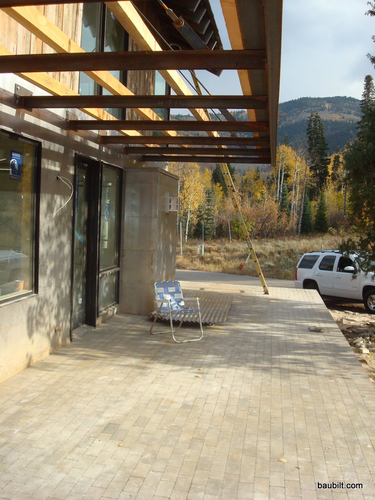 Just one defect emerged in the Park City house over the winter. About half of the main roof drains onto the front awning and then onto the paver terrace. A lot of water hits that terrace, and much of it drains down through the terrace instead of running off the front edge. As a result, the pavers settled a lot over the winter. One of the architects had suggested the possibility of inserting a 12″ c-channel into the paver surface to serve as a gutter from the point where the water hits the terrace to the edge. I wasn’t wild about introducing a 2-3″ groove in the terrace, as I thought it would be a trip hazard. Instead I designed a nifty welded gutter assembly with a slightly sloped top surface which feeds a 3″ c-channel beneath it to drain off the terrace. Hard to explain, but hopefully the pictures are clear.